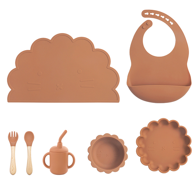 7pcs/Set Baby Silicone Children’s Tableware Waterproof Bib Food Grade Baby Dishes Plate Suction Bowl Newborn Sippy Cup And Spoon – B025-spiced pumpkin