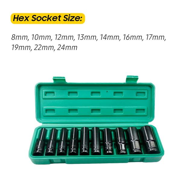 1/2 Deep Impact Wrench 8-24mm Socket Set Hexagon 78mm Length Mechanical Workshop Tool Hexs High Carbon Steel Electric Spanner – 10pcs 8-24mm C